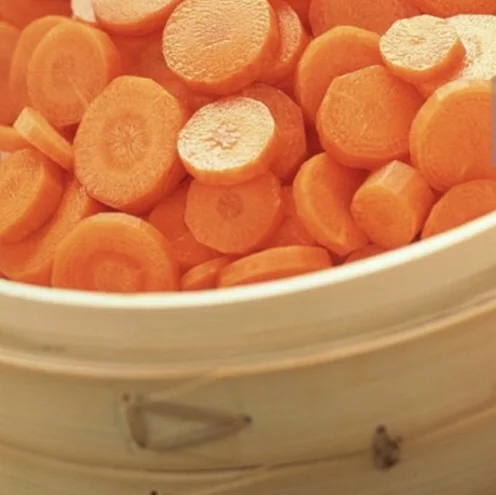 After about 10-15 minutes, use a fork to check the carrots. When you can easily pierce them with a fork, remove the bamboo steamer from the top of the pot, and set aside. Cover the pot with its lid and lower the flame to medium.