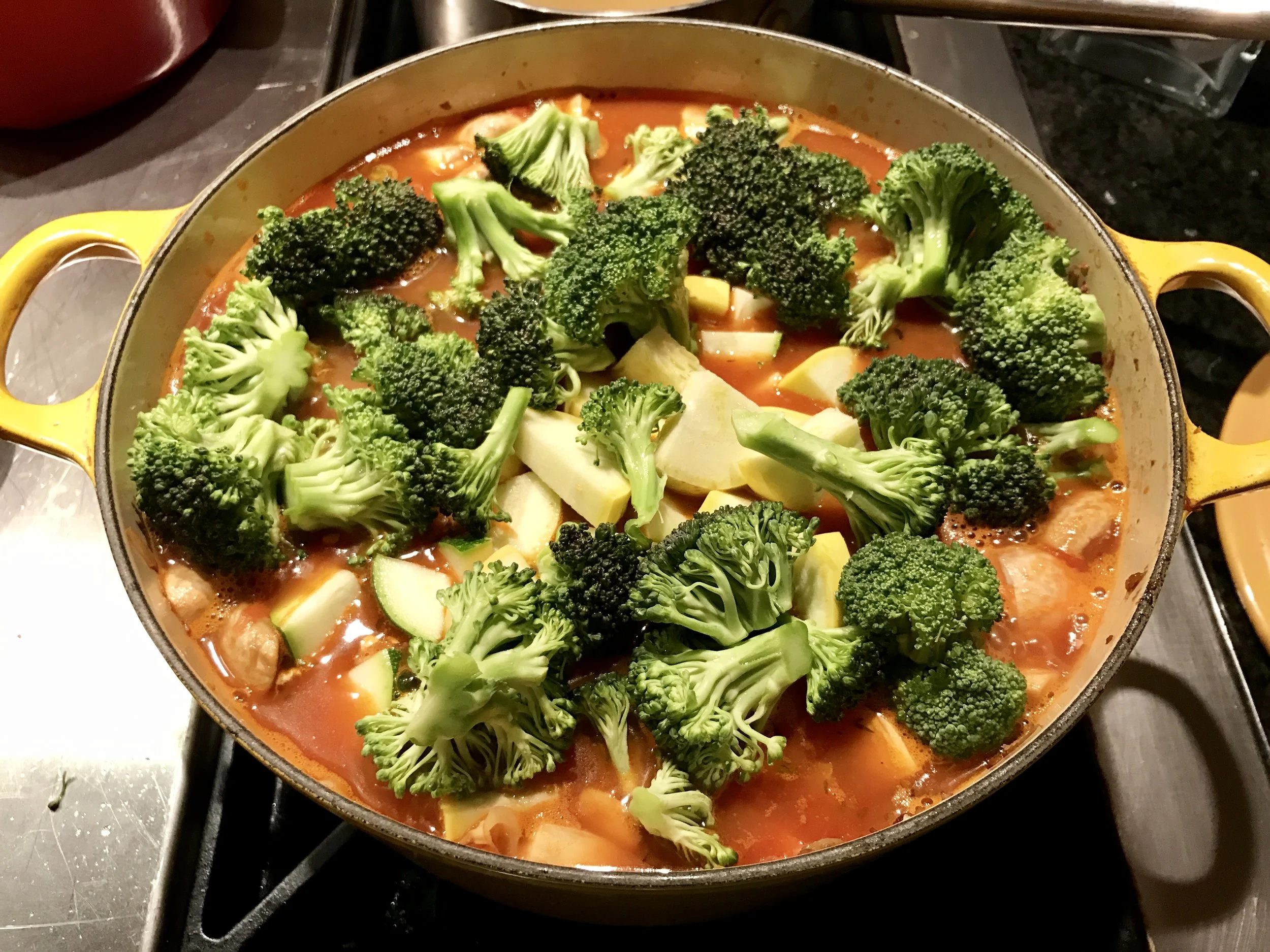 10. Then toss in the zucchini, broccoli, and/or snap peas. Simmer an additional 5 minutes or until softened.