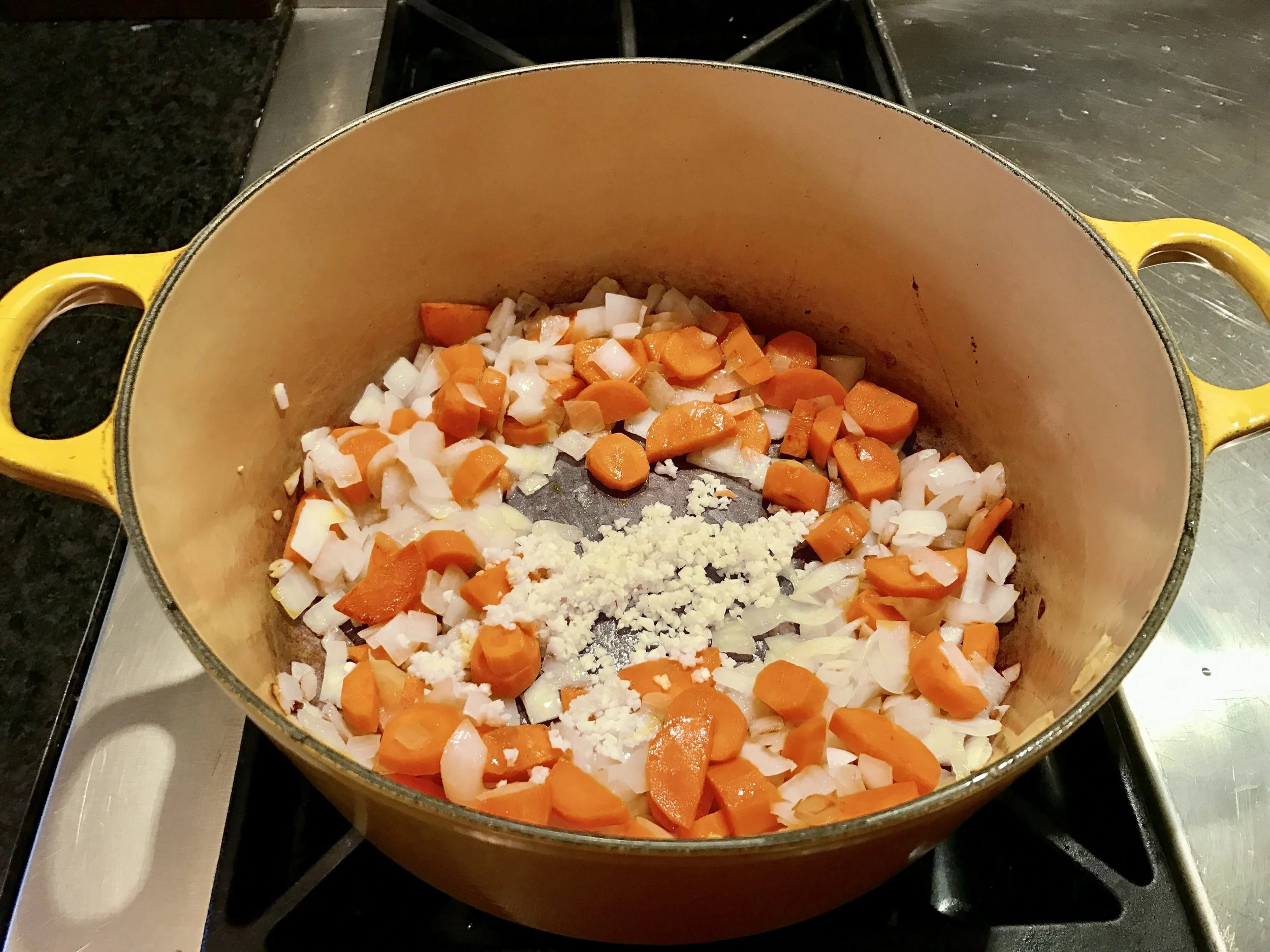 Add the diced onion and sliced carrots to the pot and cook over medium heat, mixing frequently. Cook until slightly softened, about 4-5 minutes.
