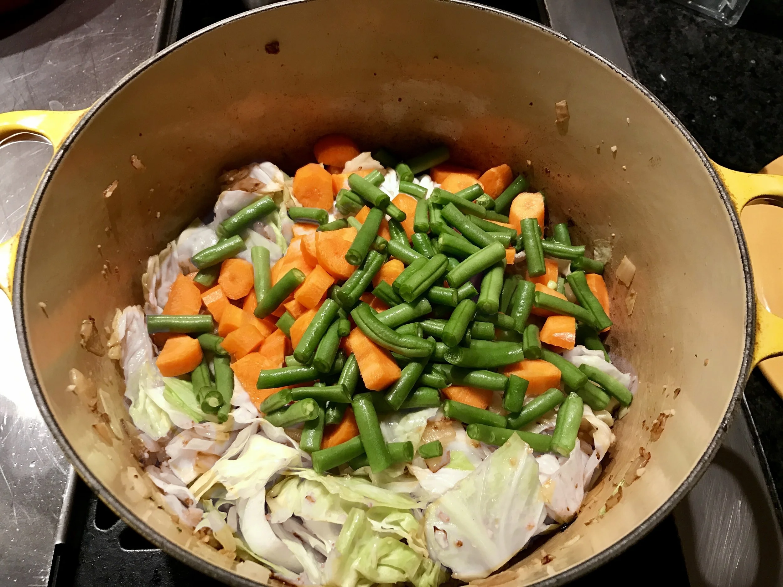 5. Add the cabbage and green beans, adding oil as necessary to avoid burning. Continue cooking over medium flame for another 5 minutes, stirring frequently.
