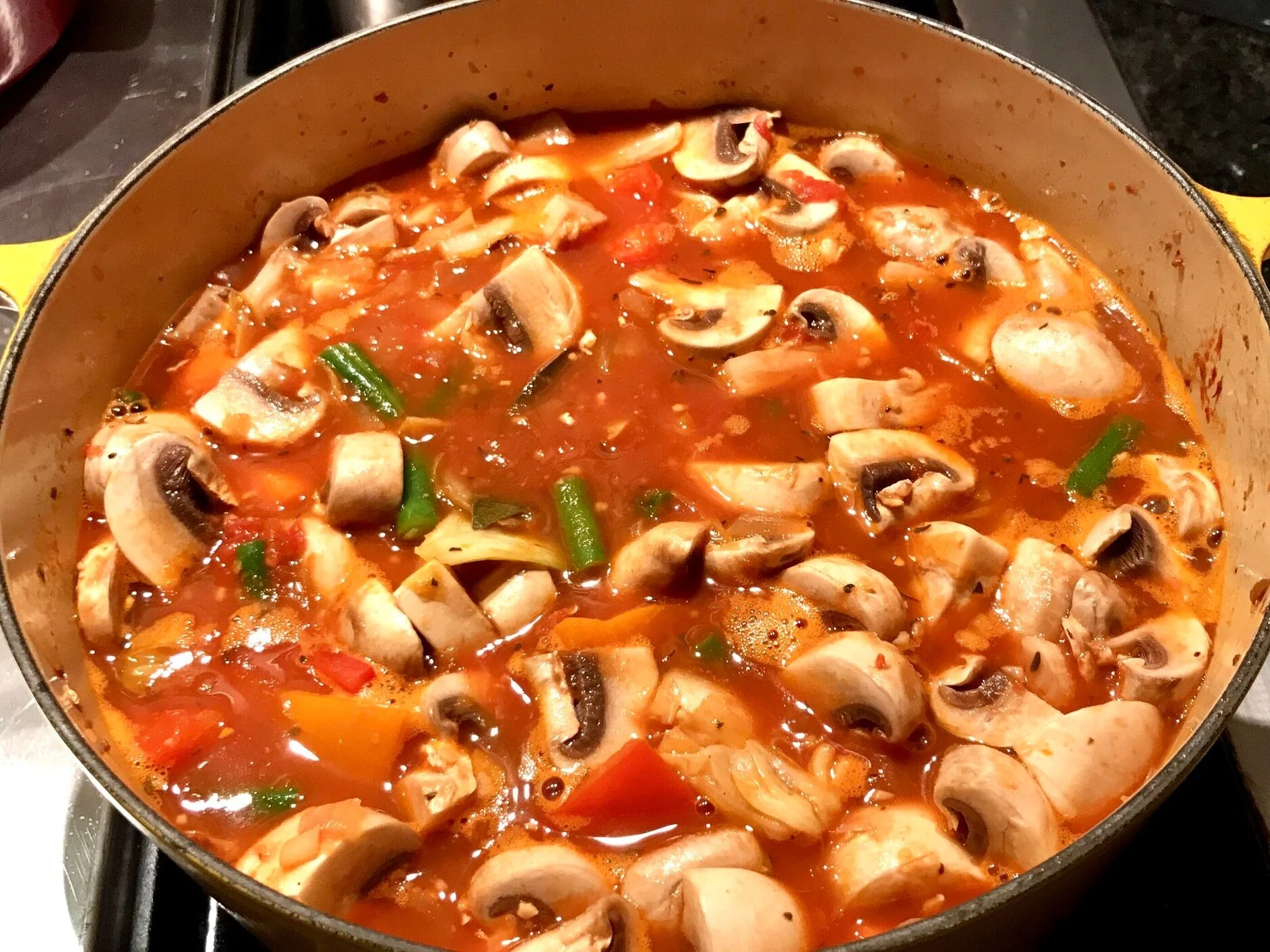 6. Stir in bell peppers (I used red and yellow for color, but you can use any color you like), mushrooms, jalapeno pepper if you like a little heat (leave the seeds for more heat), and …